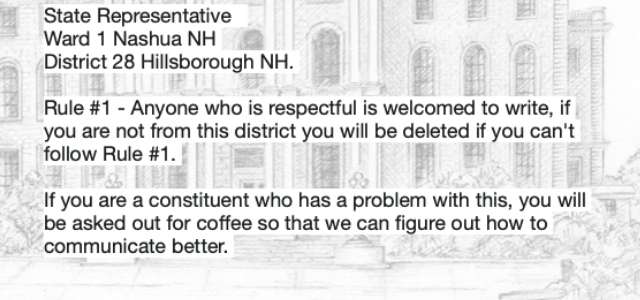 Point four, on your Facebook page, you alert persons who want to comment from outside your district that if you don’t like what they have to say (meaning if you decide they are disrespectful) you will block them. HB1159 would affect everyone in the state. (GraniteGrok is not in your district, nor is its hardware or any of its authors.) But you would exercise legislative power over people outside your district while promising to selectively block them because they don’t like how you use that power.
