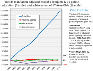 Over a period of about 50 years, we’ve tripled per-student spending (adjusted for inflation), and have seen absolutely no measurable increase in student achievement.