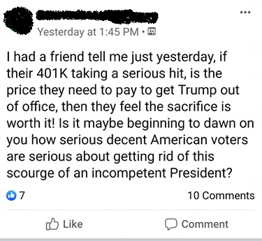 Market crash. Investments wiped out. That’s evil. I’m sorry but “Decent Americans” are not okay with that. You should be ashamed. All of you.