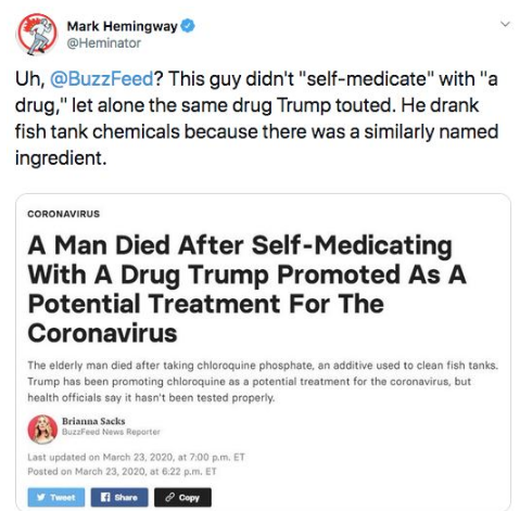 The media is responsible for the non-stop wall-to-wall panic that inspired a couple to ingest fish tank cleaning chemicals that happen to have chloroquine phosphate in them and that’s Donald Trump’s fault?