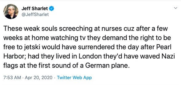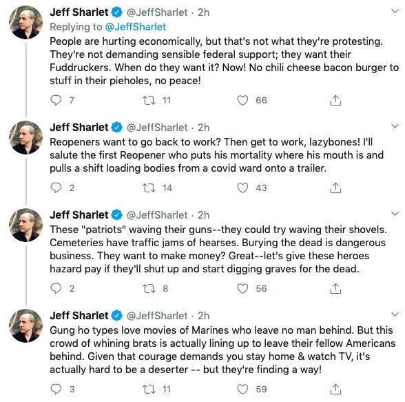 Not much use for that in the terrible world he sees from wherever the hell he has sheltered because his job is non-essential. Passing judgment on the folks who are rallying around the #Reopen movement.