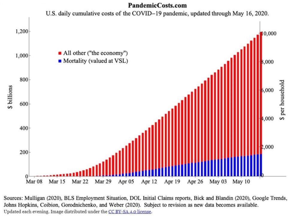 The cumulative costs through May 16, 2020 were $9,826 per household ($1.2 trillion in aggregate). 16 percent of these are mortality costs (valued at $4.3 million VSL; over the past seven days, the percentage was 16). The rest are the market and nonmarket costs of shutting down the economy, for the categories documented by Mulligan (2020). The costs above do not necessarily reflect the drop in stock prices, because much of that drop indicates costs expected to be incurred after May 16.