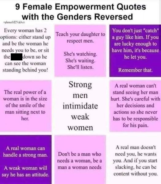 Zandra or any other “Third Wave” feminists just will sniff into the air and proceed with the normal and expected volley of words. They can’t take a joke and they can’t stand being criticized. And many can’t stand other women who are proud to be with their husband or boyfriend. But the last row, middle, is also an admonishment to a guy as well. This is also another thing these harridans don’t get – it takes two to tango and these rules apply both ways.