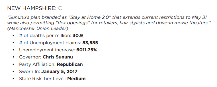 The report card is an ongoing thing so New Hampshire could improve if Flununu changes his tactics and lets us out of political prison. Dems are big on letting people out of jail. Maybe he should just frame it that way for the Democrat’s he is afraid will bludgeon him over every illness or death that follows every action.