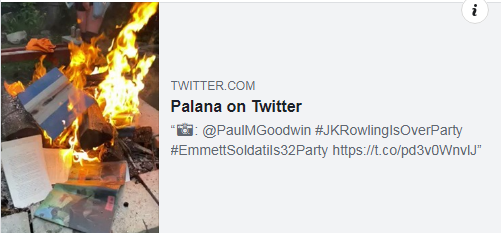 Palana tweeted a video of the book burning with the hash tag #EmmettSoldatils32Party. My interpretation was that the book burning was part of a celebration of Executive Council candidate Emmett Soldati’s 32nd birthday. Emmett Soldati is a fellow believer that men that claim to be women should have access to women’s spaces and sports. Palana quickly deleted that tweet and followed it with a tweet showing the burning of “Harry Potter and the Goblet of Fire”.