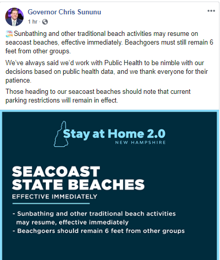 His Excellency, the Governor, will allow people to do more than just walk on New Hampshire’s beaches and swim in the ocean. An announcement this morning – expected, we had heard things – allows people to use the actual beach. Sit on it. Sunbathe. Be beachy with each other.
