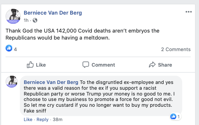 Having said all that, I am still proud of Berneice for taking a stand for what she believes. For being open and public about her disdain for a significant portion of her potential customer base. I assume she has no issue with us sharing these views to ensure that the broadest possible audience of Republicans and Trump supporters in New Hampshire – and it the widest audience – know that she has no use for their money.