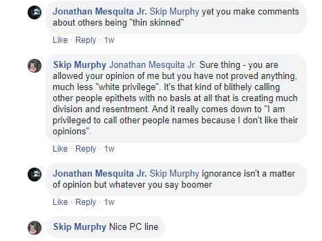 So of course, Jonathan Mesquita Jr. hauls out a very bad story; not even addressing what I had just said as if the guy who was upset with seeing BLM signs all over had shot someone. This is the level of discourse that seems to be normal with these folks – immediately find the Rhetorical Cliff and go soaring off into the Abyss of Unreasonableness in Debating.