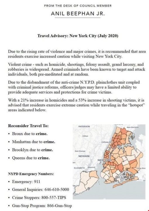 The city that can’t get to sleep (they are so #woke, get it?) has become so dangerous thanks to systemic Left-wing “leadership,” a city councilman from East Fishkill, NY, has issued a travel advisory for anyone headed to New York City. So, like Libya, but downstate!