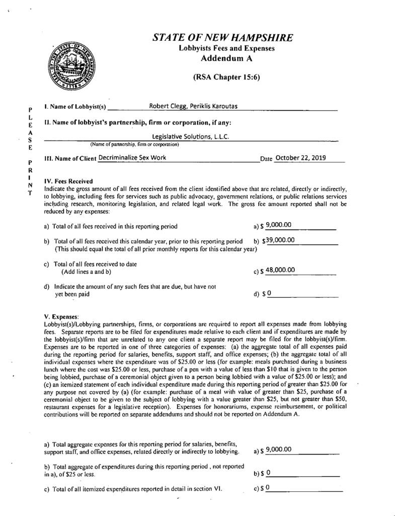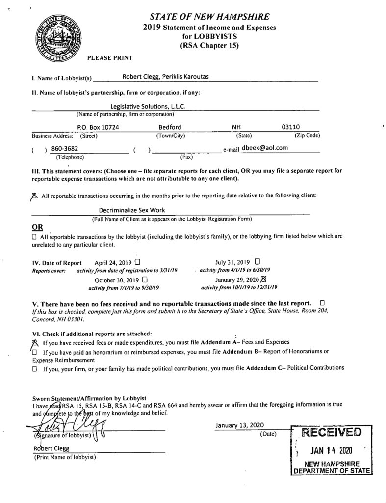 Bob Clegg is running in the Republican primary against Dave Wheeler for Executive Council District 5. In a report Clegg filed in January with the NH Secretary of State, it shows that in 2019, he and his partner earned $48,000 lobbying for the organization “Decriminalize Sex Work”.