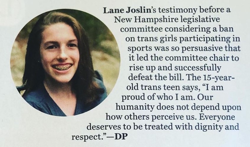 Lane Joslin, a gender-confused young man, who testified against the NH House Save Women’s Sports bill was lauded by The Advocate as a “Champion of Pride” for helping to kill the bill.