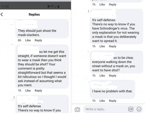 Someone shared an off-group conversation on the Grok Facebook Group page in which someone advocated for shooting people in public who are not wearing a mask. They have no problem shooting anyone on the street without a mask, while over in CA, a month after their statewide mask mandate, cases are up 160%.