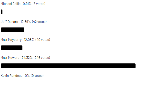 Much like the first 2020 NHCD-1 poll, Matt Mowers ran away with the win collecting 74.3% of the votes. Jeff Denaro came in second with 12.69%, Matt Mayberry was third 12.08%, Michael Callis got 3 votes, and Kevin Rondeau got none.