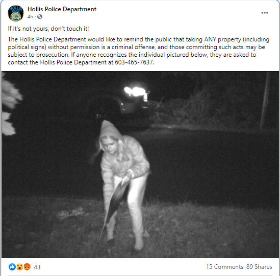 In a Facebook page update, the Hollis Police Department is looking for someone and also wanted to remind people why they are looking. Stealing is a crime and that this includes political signs. To make their point, they posted this update with an image of someone illegally removing a lawn sign.
