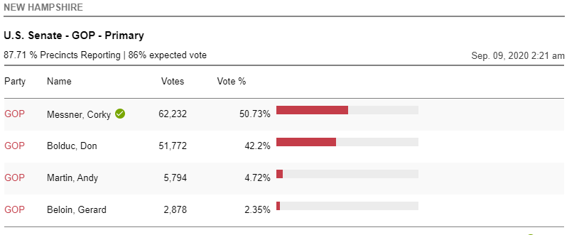 In the Corky Messner/Don Bolduc race, AP has called it for Messner with 86% reporting, but Gen. Bolduc has not conceded.