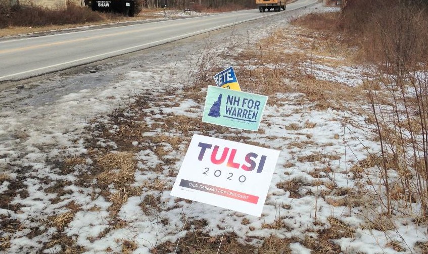 Case in point. If Tom was out picking up signs, why did he take Hollis GOP signs but didn’t walk away with these Democrat signs nearby?