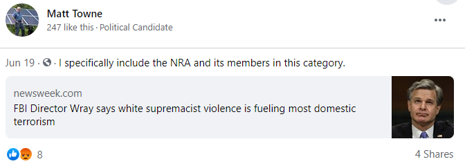His opposition finds a voice (probably for the 1000th time) in this remark from June 19th about the FBI investigating White Supremacists. “I specifically include the NRA and its members in this category.”