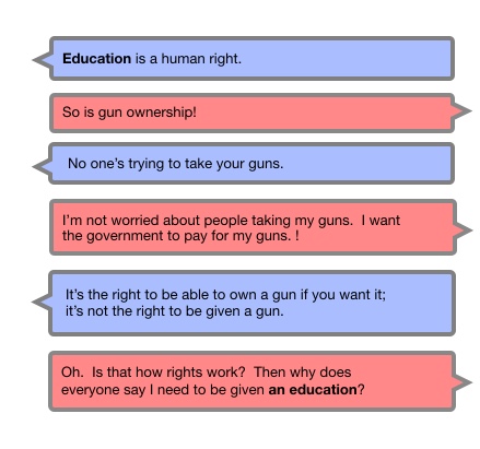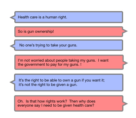 A while back, a meme was going around that clarified an important distinction between rights and entitlements, and nicely illustrated what kind of nonsense you get when you mix those up. It went something like this: