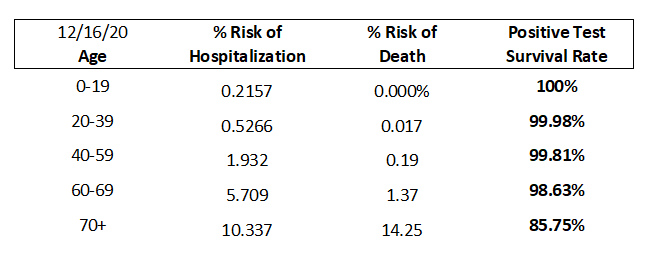 These figures represent your risk of hospitalization or death if you test positive for COVID19 and your survival rate after testing positive based on 9 months of state data.