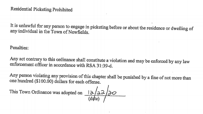 residential_picketing Newfields NHThose protests are scheduled to continue and the State and local police, based on the 12/8/20 minutes, are eager to enforce the new restrictions.