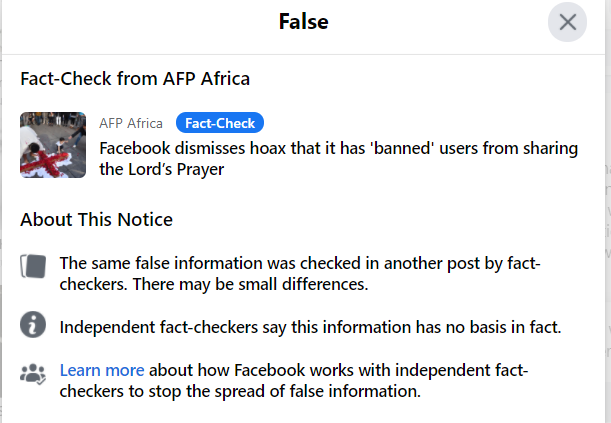 The original status update includes nothing about Facebook banning the Lord’s Prayer. It’s just the Lord’s prayer. But stupid facebook assumes it is about that and adds their third-party fake check to prove themselves…wrong.