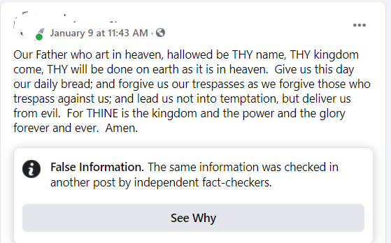 Facebook sucks. They use word and image search defaults that erroneously flag status updates as false or misleading. You then get dinged for their incompetence. Take The Lord’s Prayer. If you post it, Facebook flags it as false information. If you check ‘See Why,’ it tells you Facebook is not doing what it just did.