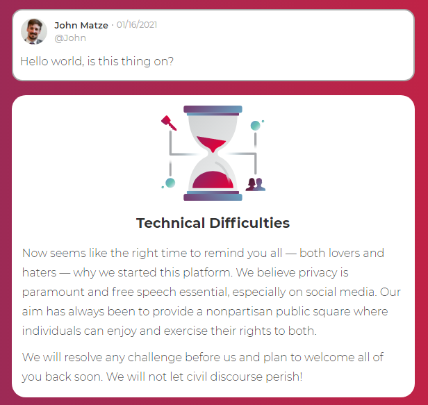 Facebook has been flagging news about the “return” of Parler as false. It is fair to say that Parler is not back the way it was before Amazon pulled the plug (lawsuits underway for breach of contract). But if you go to Parler.com, there is a Parler page with a message.