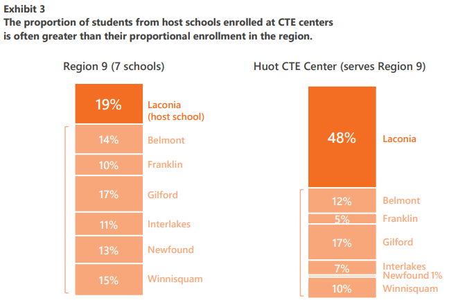 In speaking with New Hampshire stakeholders and examining enrollment data, the evaluation found that the primary factor impacting students’ participation in CTE was whether they attended a host or sending high school within their region, rather than factors such as gender, race, ethnicity, socio-economic status, special education status, or English learner status.