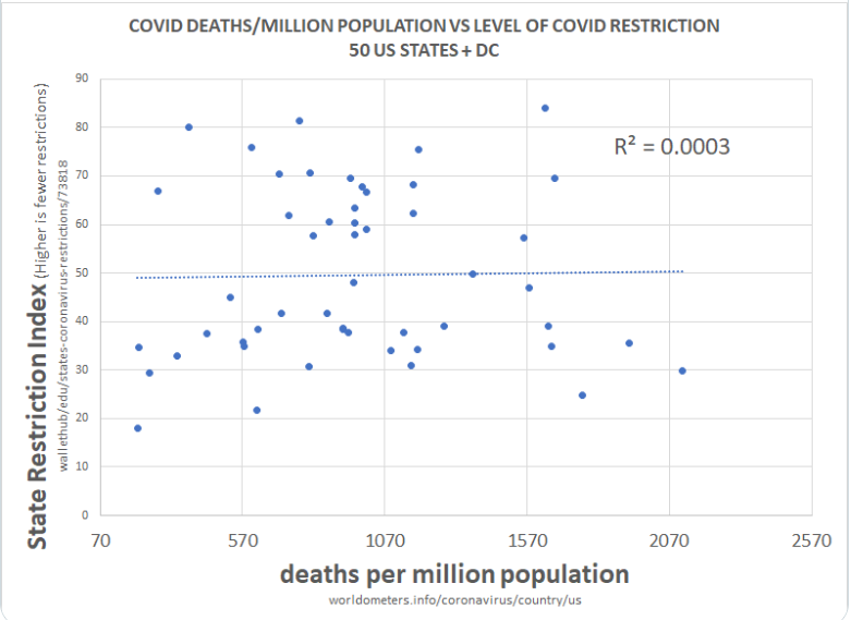 Look at this data plot comparison between COVID-19 deaths and the strictness of the political response for all 50 states and DC. Nothing politicians have demanded has done more or less than those who did more or less.