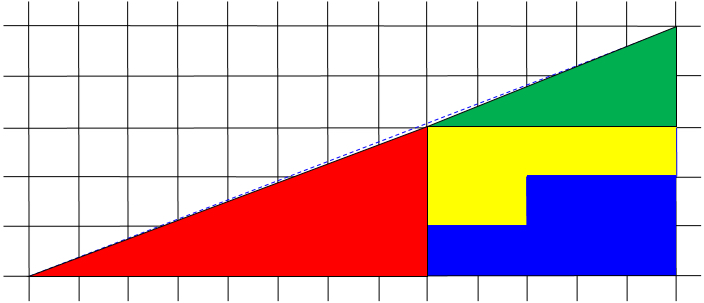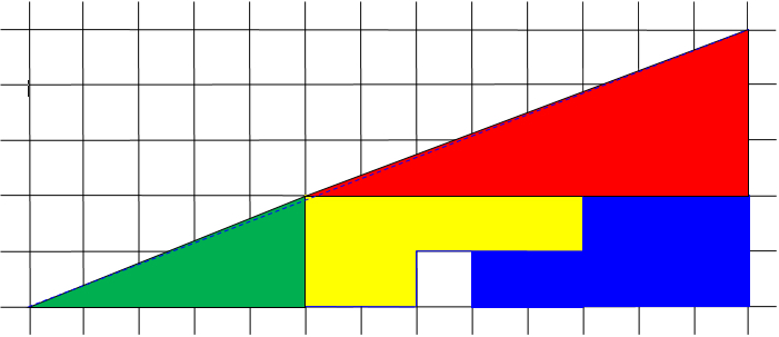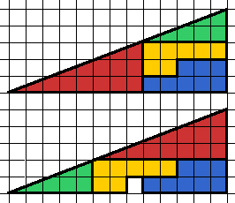 So in fact, neither of the ‘triangles’ is really a triangle at all. Each is a quadrilateral in which one of the angles is nearly 180 degrees. The thickness of the line in the original figure is used to mask the change in slope; but the area between the convex and concave ‘hypotenuses’ is the area of the white square in the bottom triangle.
