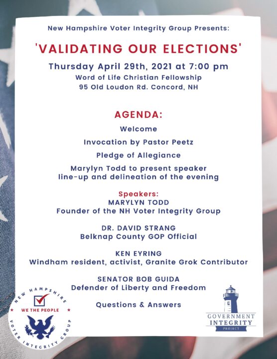 The NH Voter Integrity Group is hosting a FREE event on Thursday, April 29, 2021 at 7pm in Concord, NH to provide the latest news on the forensic audit of the the Windham voting machines and ballots, including concerns regarding the forensic auditor who was selected by the Town of Windham.