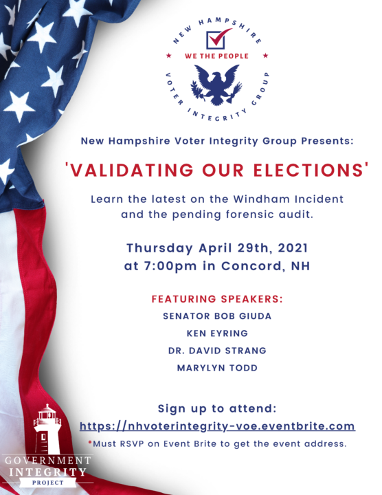 The NH Voter Integrity Group is hosting a FREE event on Thursday, April 29, 2021 at 7pm in Concord, NH. The featured speakers will be Senator Bob Giuda, Windham resident and activist Ken Eyring, Belknap County GOP Official Dr. David Strang, and NH Voter Integrity Group Founder Marylyn Todd.