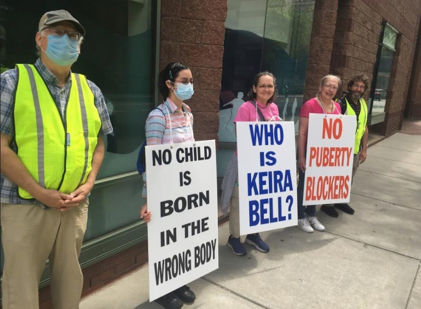 On Saturday, May 22, six of us, representing Can I Get a Witness, stood outside the clinic holding signs to call attention to what is being done to children inside the unmarked building: “Gender Clinics Harm Children,” “No Child is Born in the Wrong Body,” “No Puberty Blockers,” and “Who is Keira Bell?”