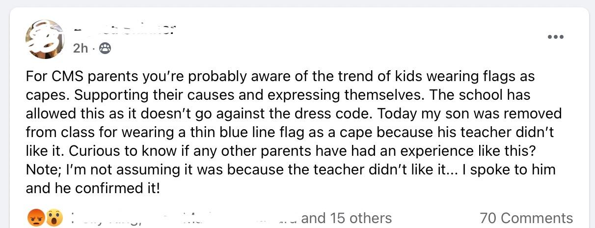 Recently a student attending the Cooperative Middle School in Exeter (SAU 16) was told that he could not wear the Thin Blue Line Flag in school. But school administrators have allowed students to wear the American flag and the Pride Flag.