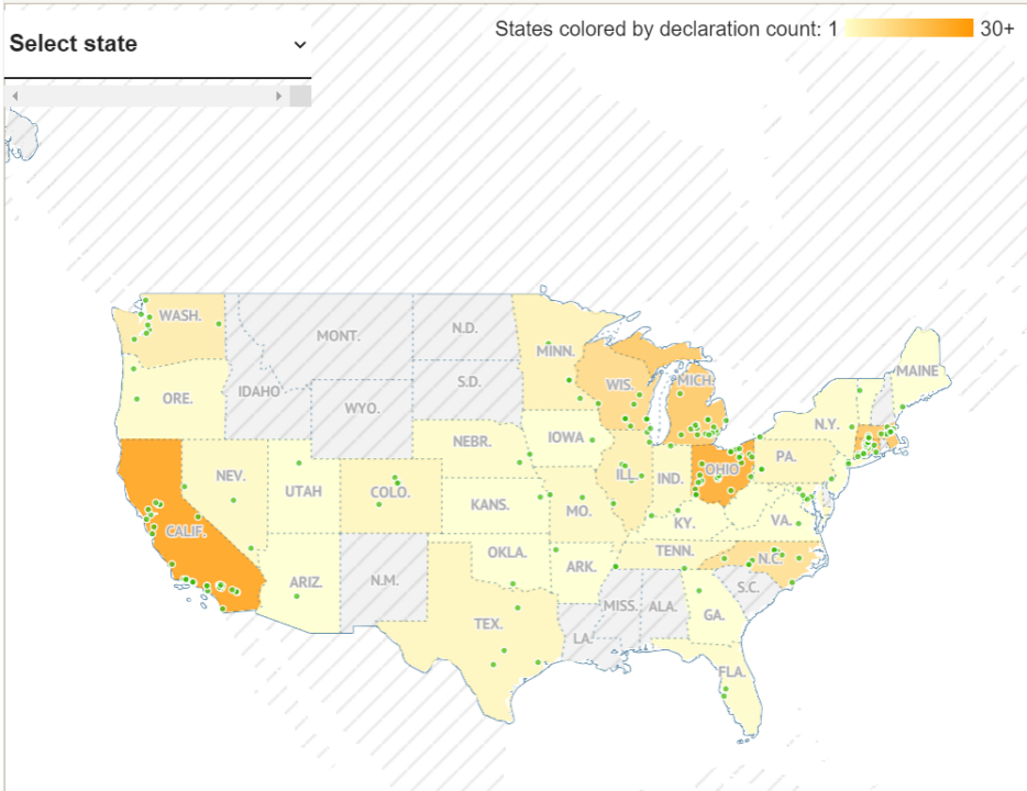 Here’s a link to the map and a screengrab. The green dots are a declaration concerning a supposed threat to public health by racism (NH has zero, by the way).