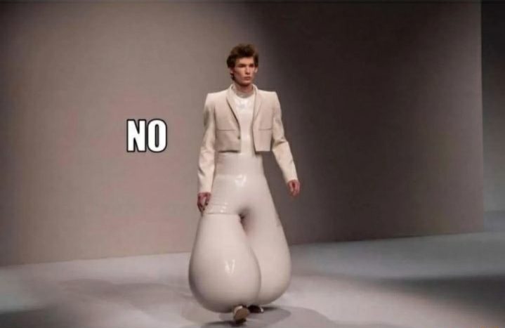 I hope the pantsuit comes with a custom designer inflator and patch kit if you have to pop (not poop) your pants to tie your shoes. Or maybe loafers but nice ones.