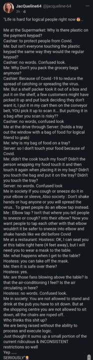 @JacQueLine-64 is a gab user with over 11 thousand followers, and what I am about to share from her might be why. It’s called “Life is Hard for Logical People Right Now.”