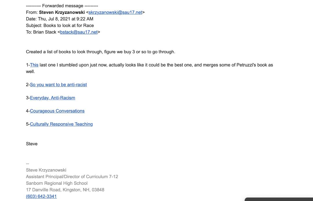 If this agenda of prejudice is then taken to students in Sanborn, what does that mean for children? Will they also be shamed for the color of their skin? That’s what is happening in Exeter. The district spent money on a book for Middle School children that is full of shame and blame aimed at children born with white skin.