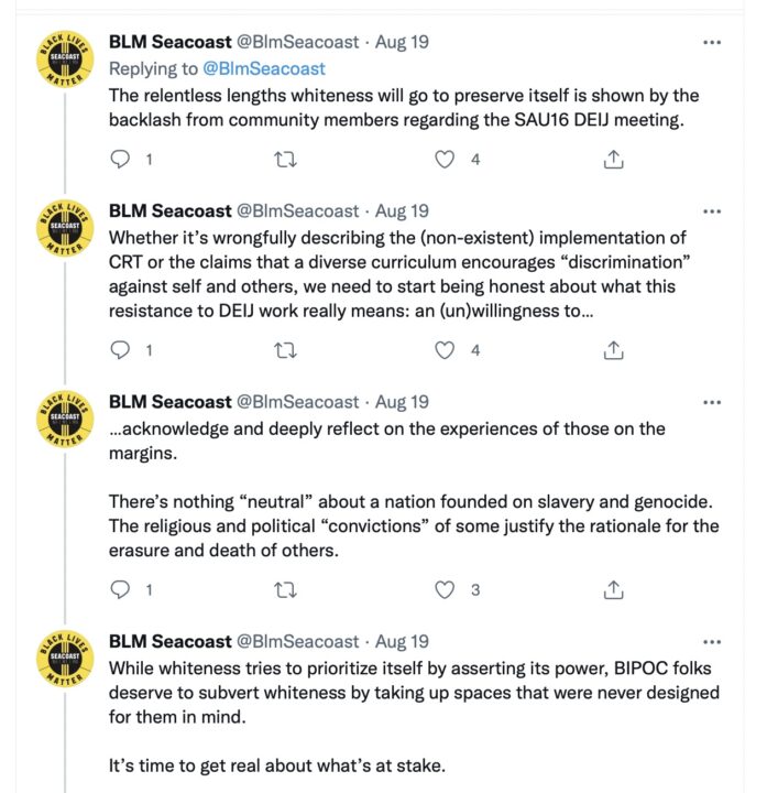 Last week’s meeting at Exeter High School to cover the dog and pony show about Diversity, Equity, Inclusion and Justice, included several members of Black Lives Matter who were in attendance. An alert went out by BLM Seacoast asking people from all over to attend.