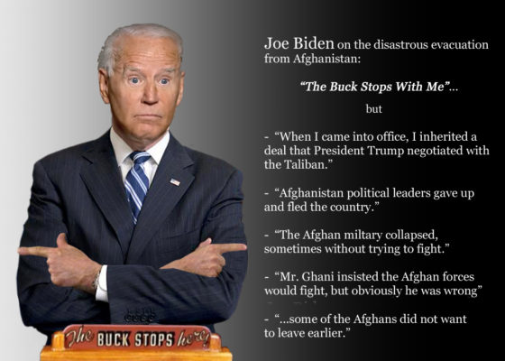 On August 16th, he began by blaming President Trump, President Ghani, the Afghan military, and unavoidable circumstances for the crisis at the Kabul Airport. Near the end of his remarks, he proclaimed, “I am president of the United States of America, and the buck stops with me.” Considering his finger-pointing introduction, reasonable listeners know that line, borrowed from Harry Truman, was nothing more than a feeble attempt to sound like a leader. He repeated it a few days later.