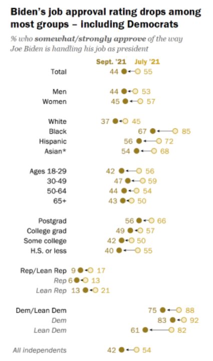 He’s down 14 points with young people, 12 points with women, but more importantly, 14 points with Democrats. Lean Dems are down 21 points, and Independents are down 12.