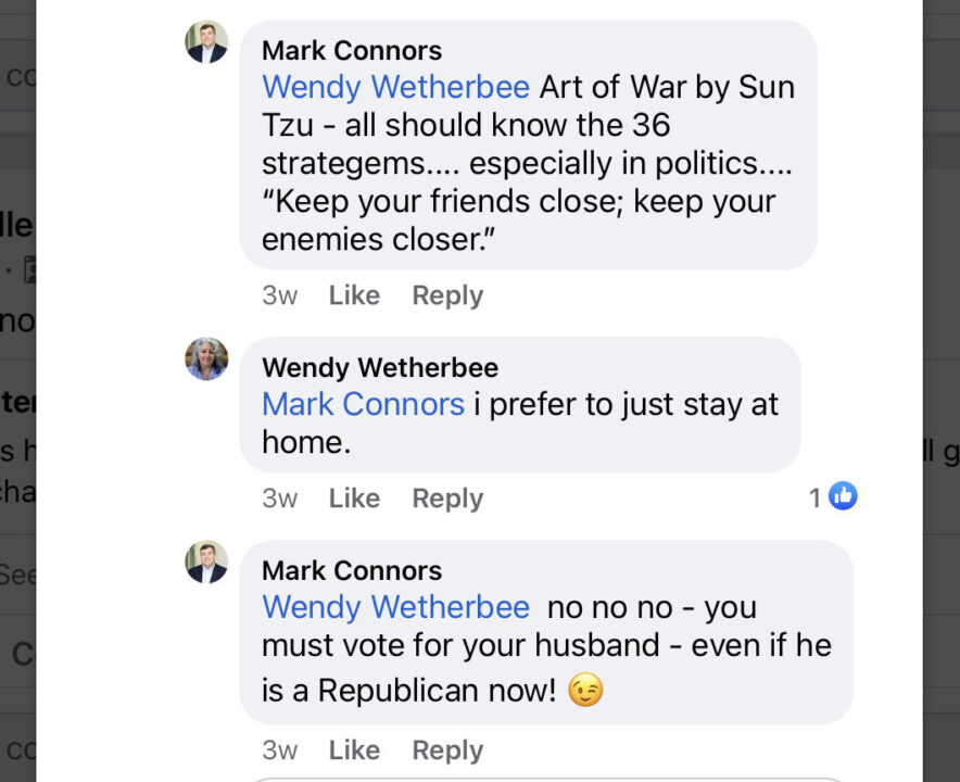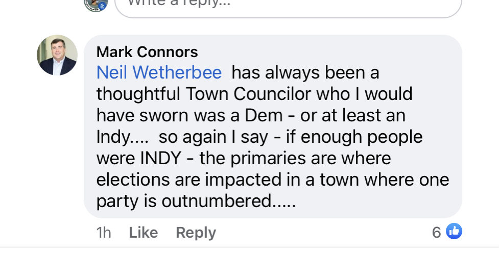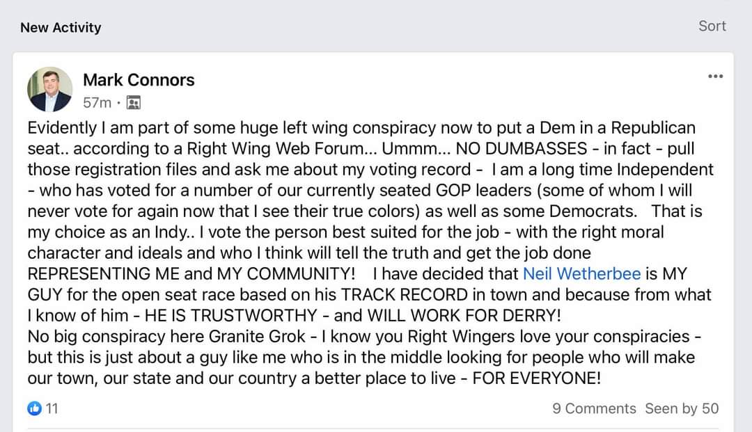 Mark Connors suggests that Democrats change to Indy to “effect change.” Derry is an R+4 Republican town, so he wants to change it to what? Something other than Republican, obviously. And in this case, he is replying to a message from David Clapp about the Republican Primary on Oct. 19th.