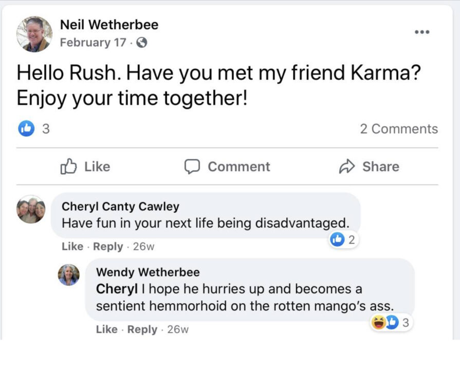 Sorry, that’s fake republican Neil Wetherbee and his wife being happy about Rush Limbaugh being dead. I meant this.