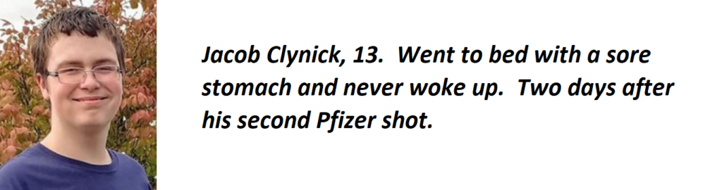 Jacob Clynick, 13. Went to bed with a sore stomach and never woke up. Two days after his second Pfizer shot.