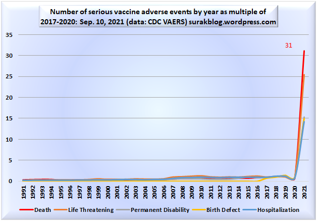 Perhaps throwing in one of Surak’s graphs at the top (link is to his latest such graph post, but do check his site for updates which he does regularly), using his title: “Number of serious vaccine adverse events by year as a multiple of 2017-2020”. Right below the title, a question, in bold and large: