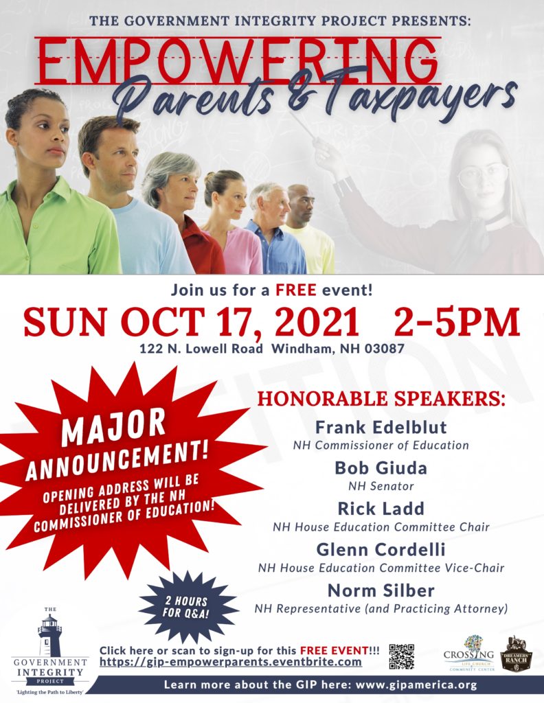HUGE NEWS! NH Commissioner of Education Frank Edelblut will deliver the Opening Address at the Government Integrity Project’s (GIP) Empowering Parents & Taxpayers FREE event THIS SUNDAY (10/17/21), from 2p – 5p at 122 North Lowell Road, Windham, NH 03087 (Crossing Life Church).