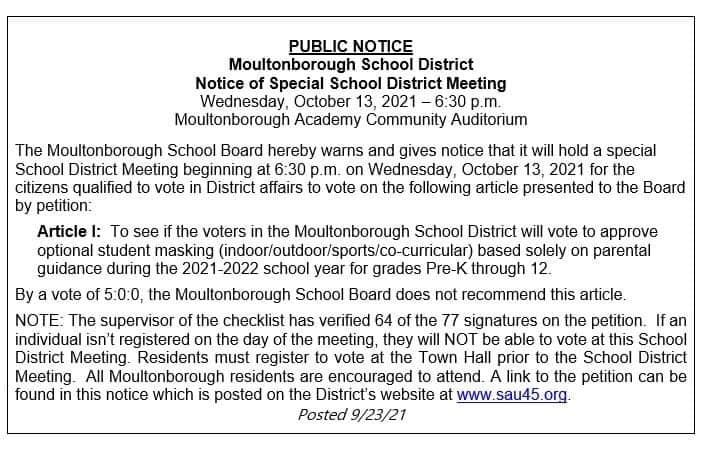 The town of Moultonborough has called a special town meeting to vote on a petition warrant article for the School District (SAU45) – and the School Board is pissed. If it passes they lose any authority to mandate masks in the school district.