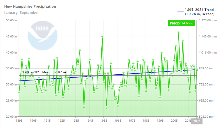 Just a quick precipitation update from our friends at NOAA. The 9-month total in 2021 for New Hampshire is 34.65 inches. That’s two inches about the historical mean for the same period.