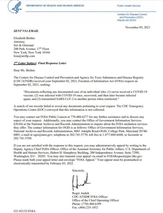 Well … the CDC received a FOIA (Freedom of Information Act) request back in September that essentially said “put up or shut up” … that is, show us all the evidence you have that there is no natural immunity to COVID.