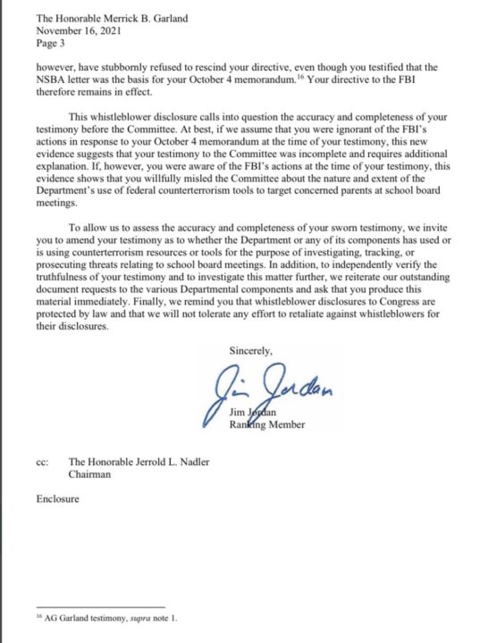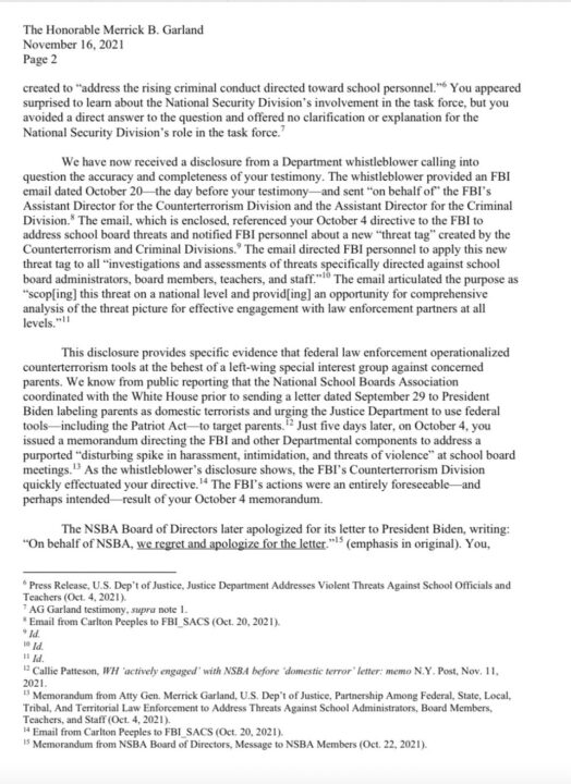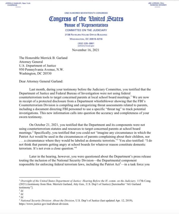 “We are now in receipt of a protected disclosure from a Department Whistleblower showing that the FBI’s Counterterrorism Division is compiling and categorizing threat assessments relating to parents, including… a threat tag to track potential investigations.”